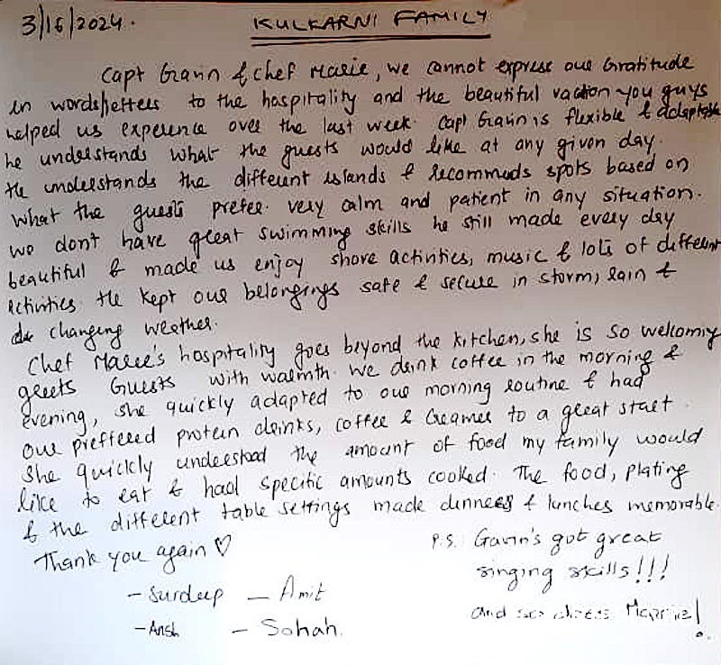 We cannot articulate our extreme appreciation on one page, for an incredible week! From Grenada all the way up to Bequia and back - it was full of incredible memories. Gavin, your talent behind the helm is only eclipsed by your extraordinary culinary skills! Every meal was a celebration and the accommodations you made including the most delicious gluten free chocolate birthday cake! Each meal was delicious and completely different - The fresh fish! The pastries! The salads! The seasonings! All perfection!