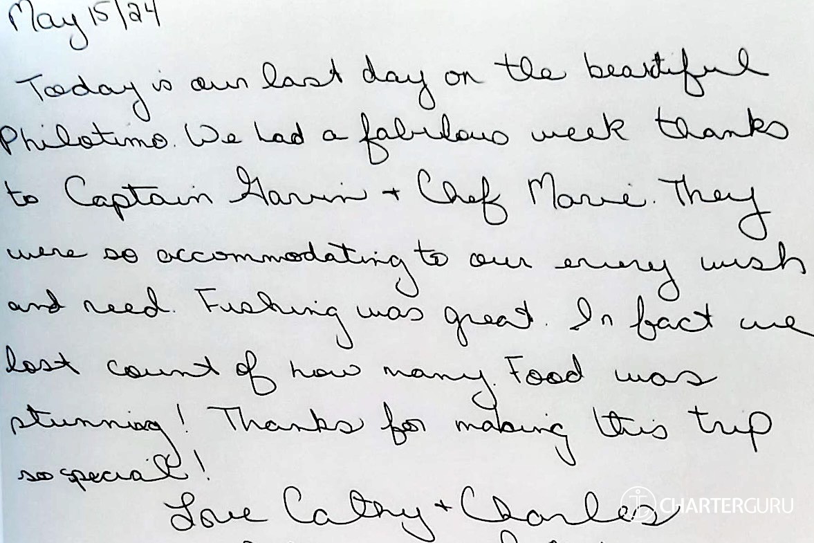 We greatly appreciated your hospitality aboard the beautiful Philotimo. It was absolutely wonderful enjoying the BVI during our charter and you each made our trip extremely nice.